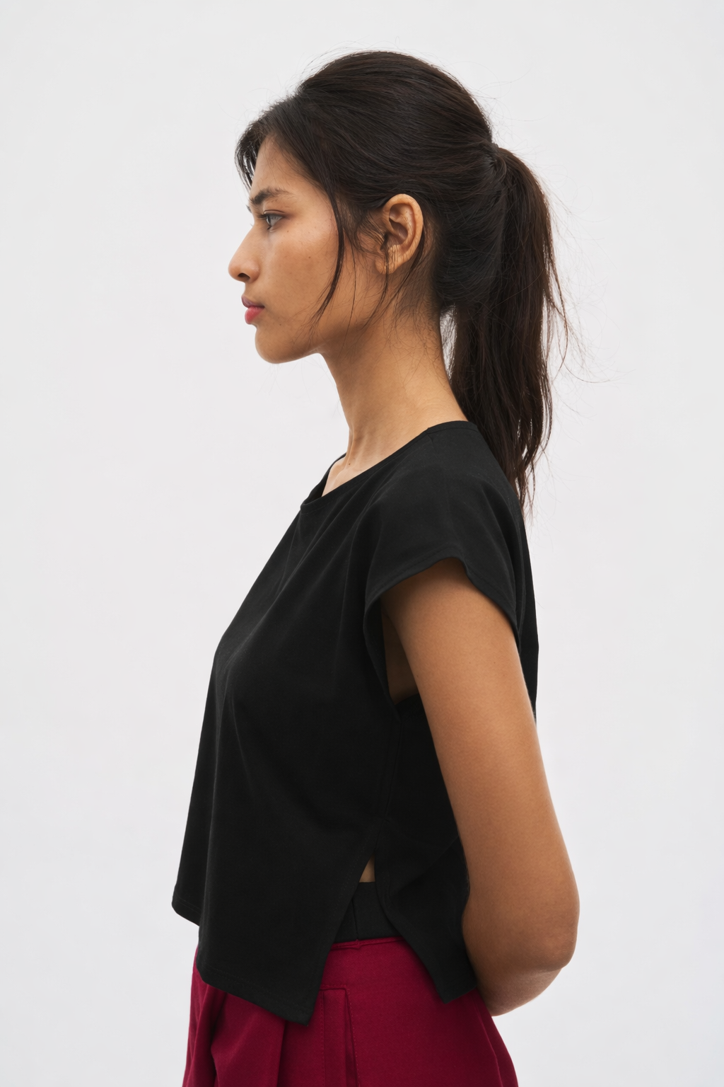 El cuello redondo y la manga corta equilibran el diseño, mientras una apertura lateral deja visible parte del costado izquierdo, aportando movimiento y un detalle sutil pero poderoso.