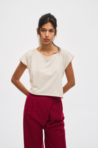 PARTES reemplaza el sistema de patronaje tradicional de cortes y curvas por un plano absoluto cuadrado o rectangular que arma la silueta a través de sus pliegues y tensiones.